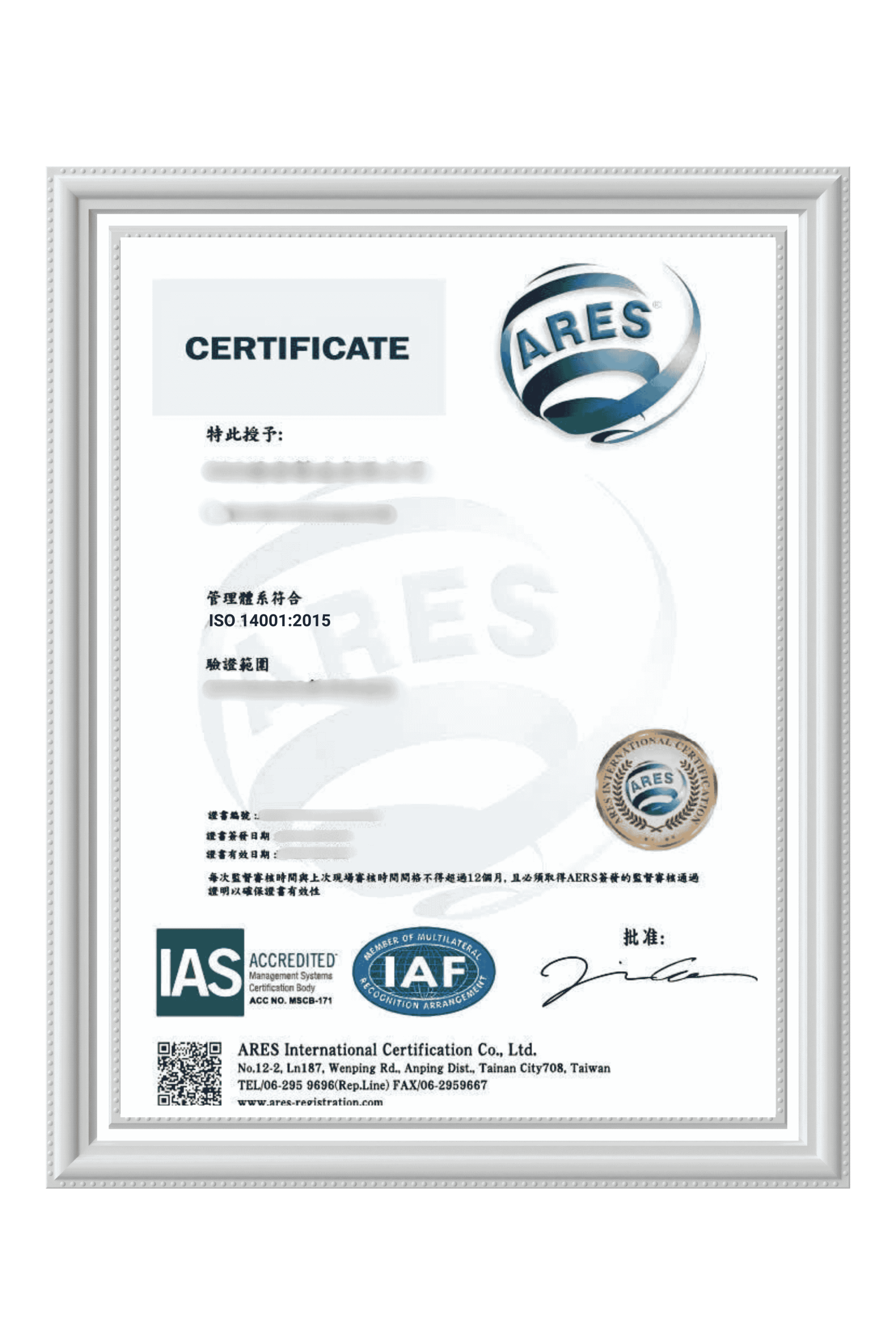 其中,ISO 14001:2015 认证证书即为明确证明,表示企业已经建置、运行并持续改进环境管理体系,且以系统化与透明方式落实,并获得全球认可