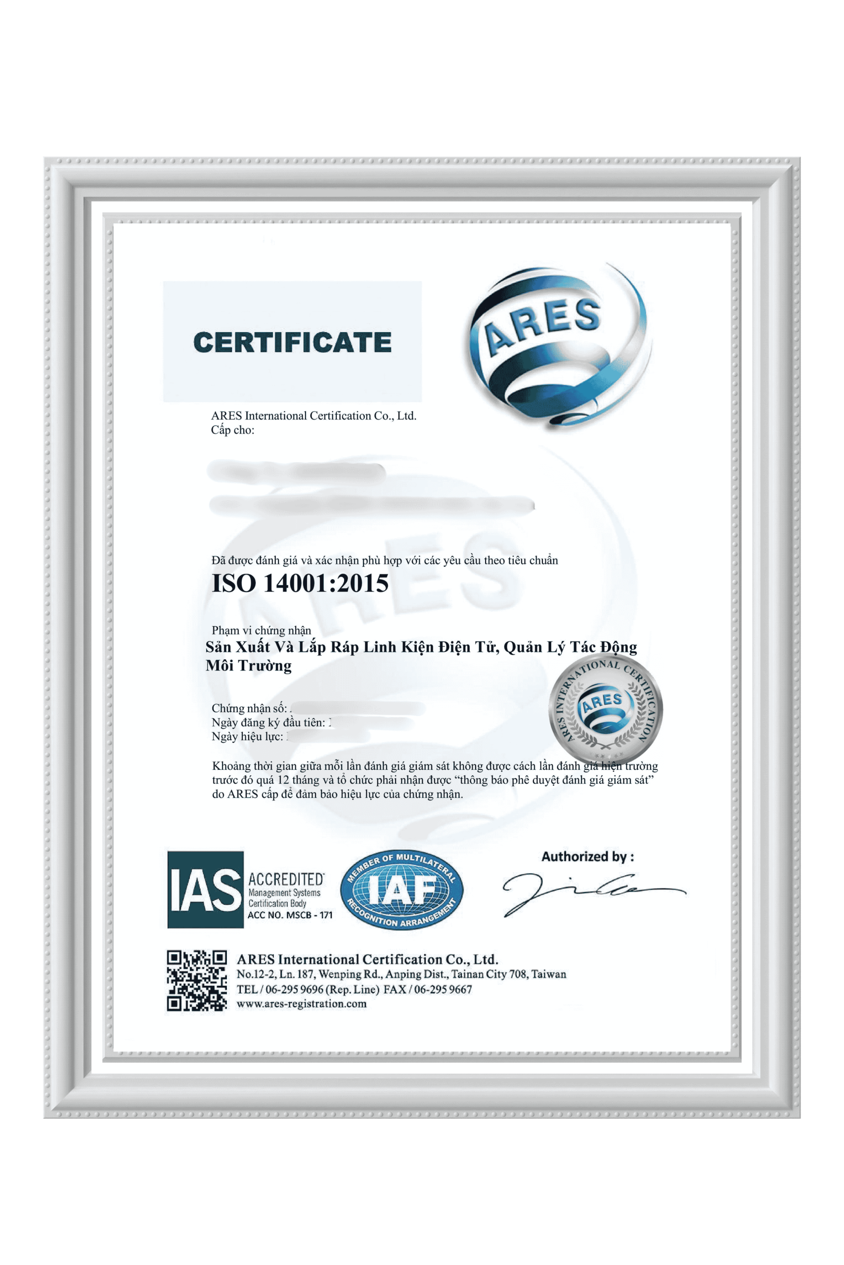 由越南亚瑞仕颁发的 ISO 14001:2015 证书,附有 IAS 与 IAF 标志 — 全球价值与认可的权威保证