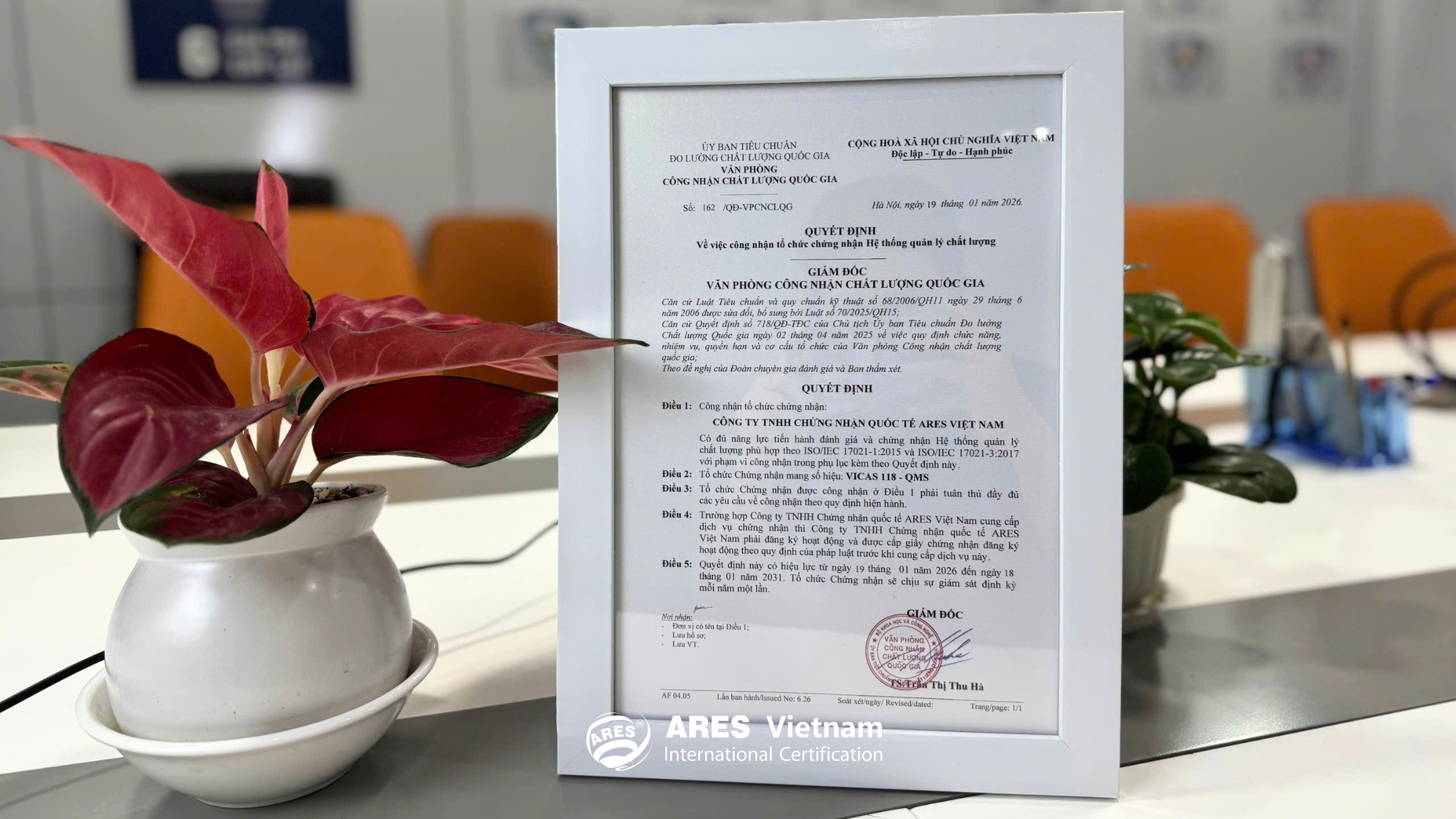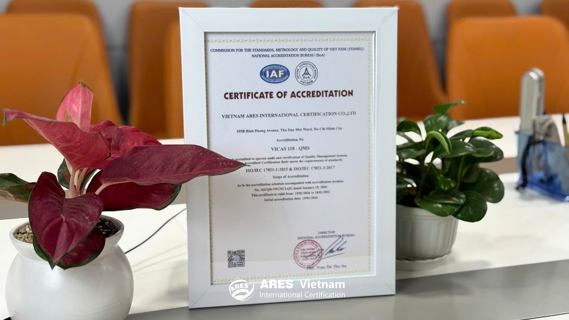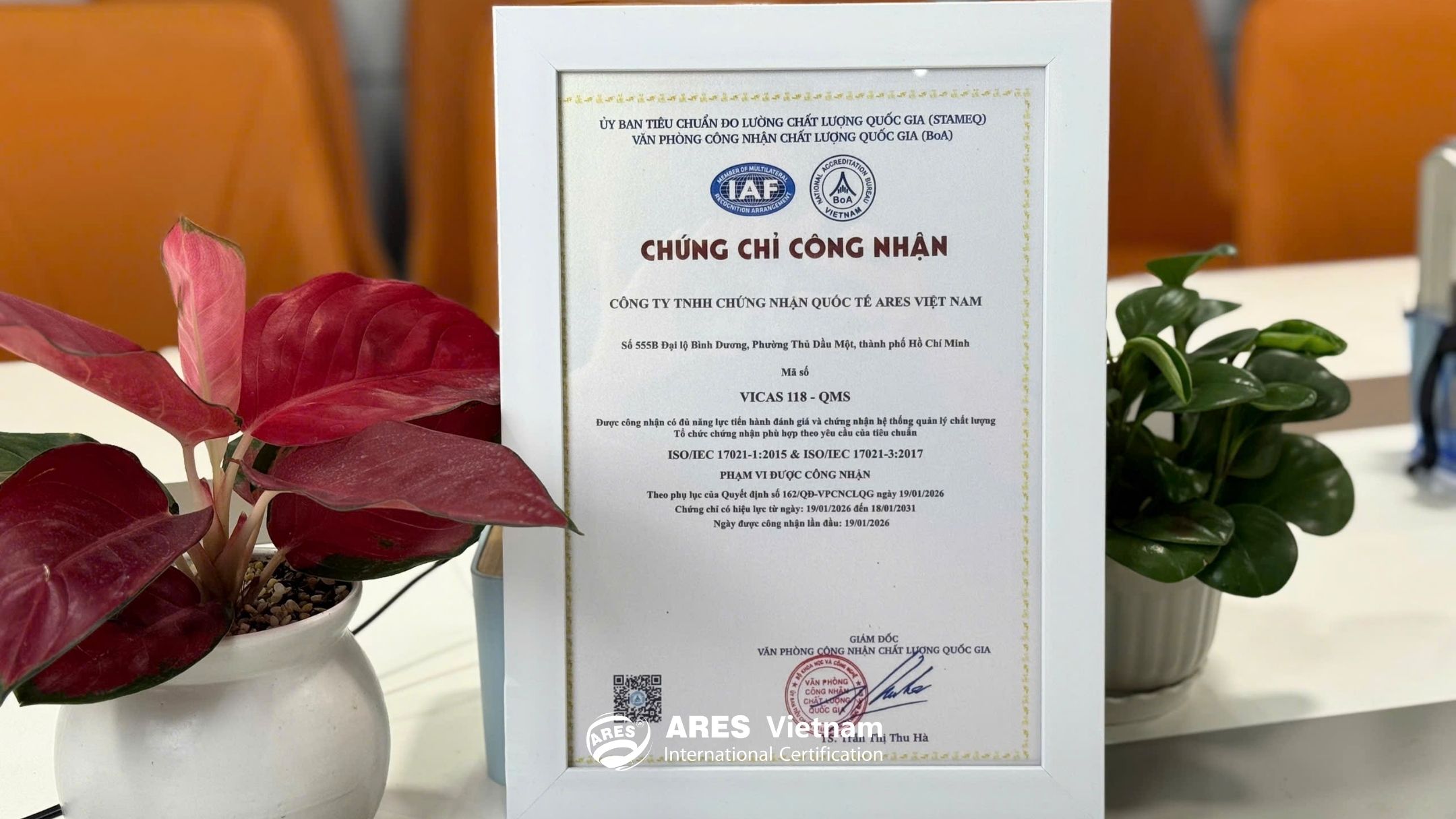 2026年01月19日,隸屬於國家標準計量品質委員會之國家品質認可辦公室(VICAS)頒布第162/QĐ-VPCNCLQG號決定,認可越南亞瑞仕國際認證有限公司符合依據 BOA(Bureau of Accreditation)原則之國際認可準則,具備依下列標準執行品質管理系統(QMS)評估與認證之能力: